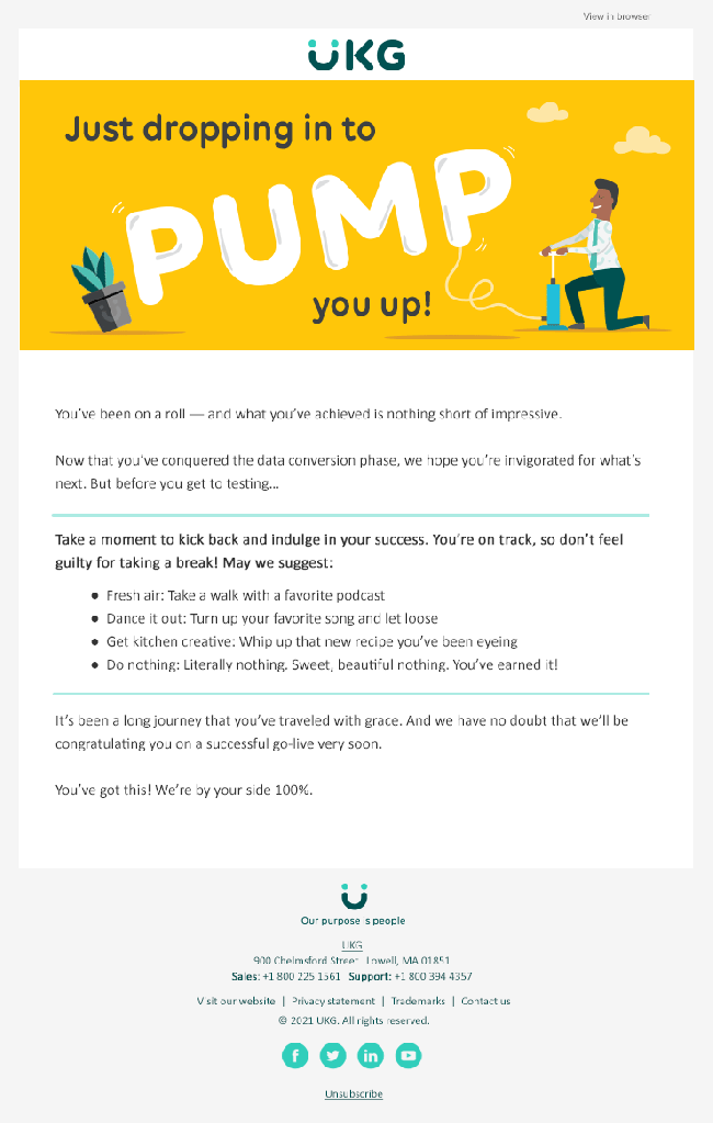 This email communication was part of a customer delighter campaign, to keep customers engaged during the implementation process. This was achieved with the warm, bold color palette and with the fun animation.