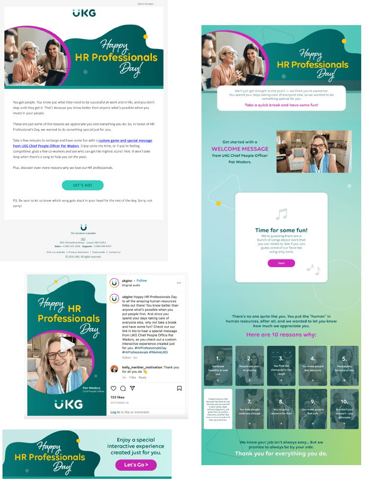 This was targeted to people in the Human Resources industry, as a fun way to celebrate this day. It included an email, multiple social graphics, and website banners, all directing to an integrated Ceros experience. I worked with the Ceros team on the layout, colors, and design elements to match the rest of the campaign look that I had created.
